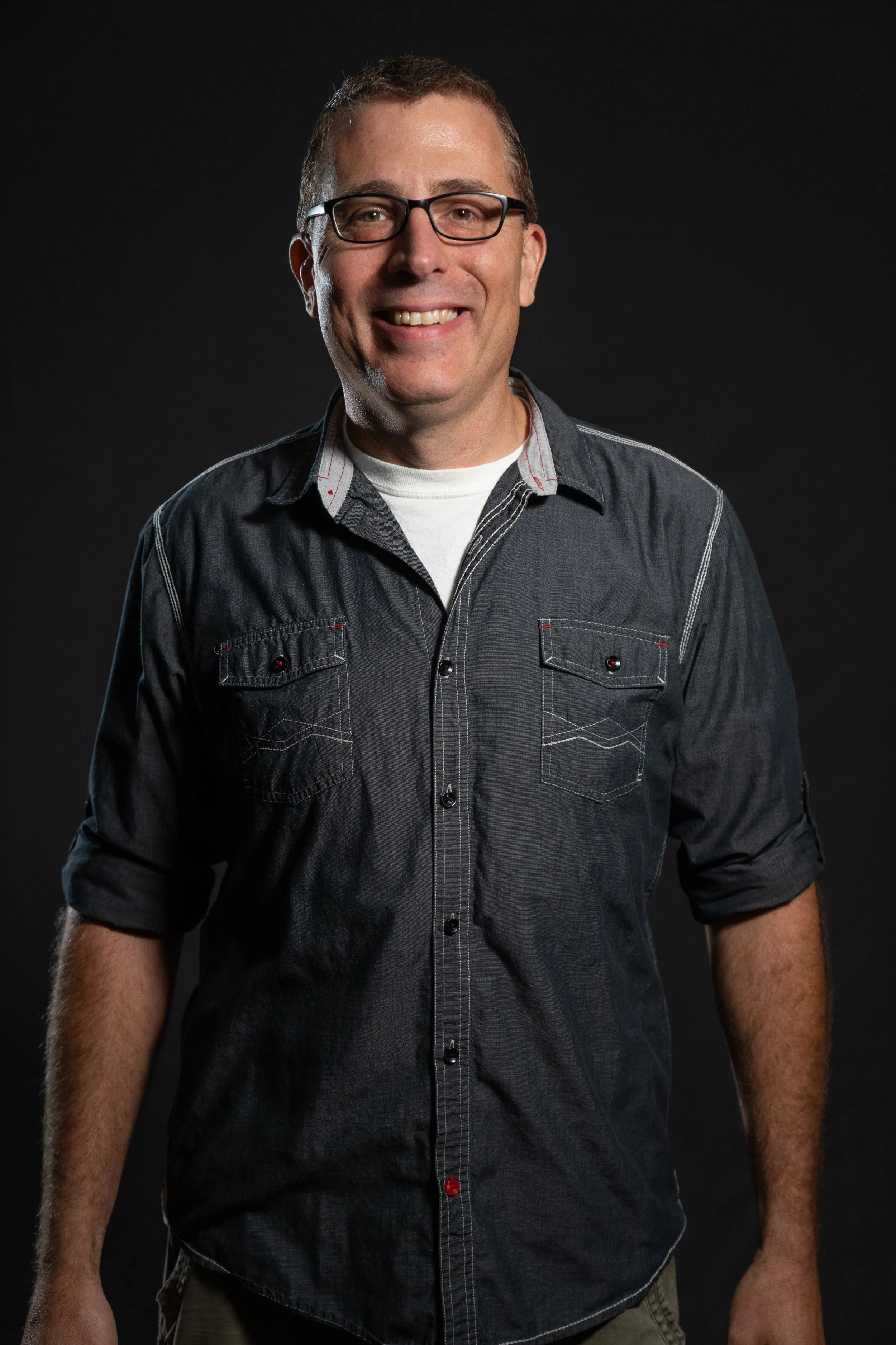 A smiling man wearing glasses, a dark denim button-up shirt, and a white t-shirt underneath, standing against a black background.