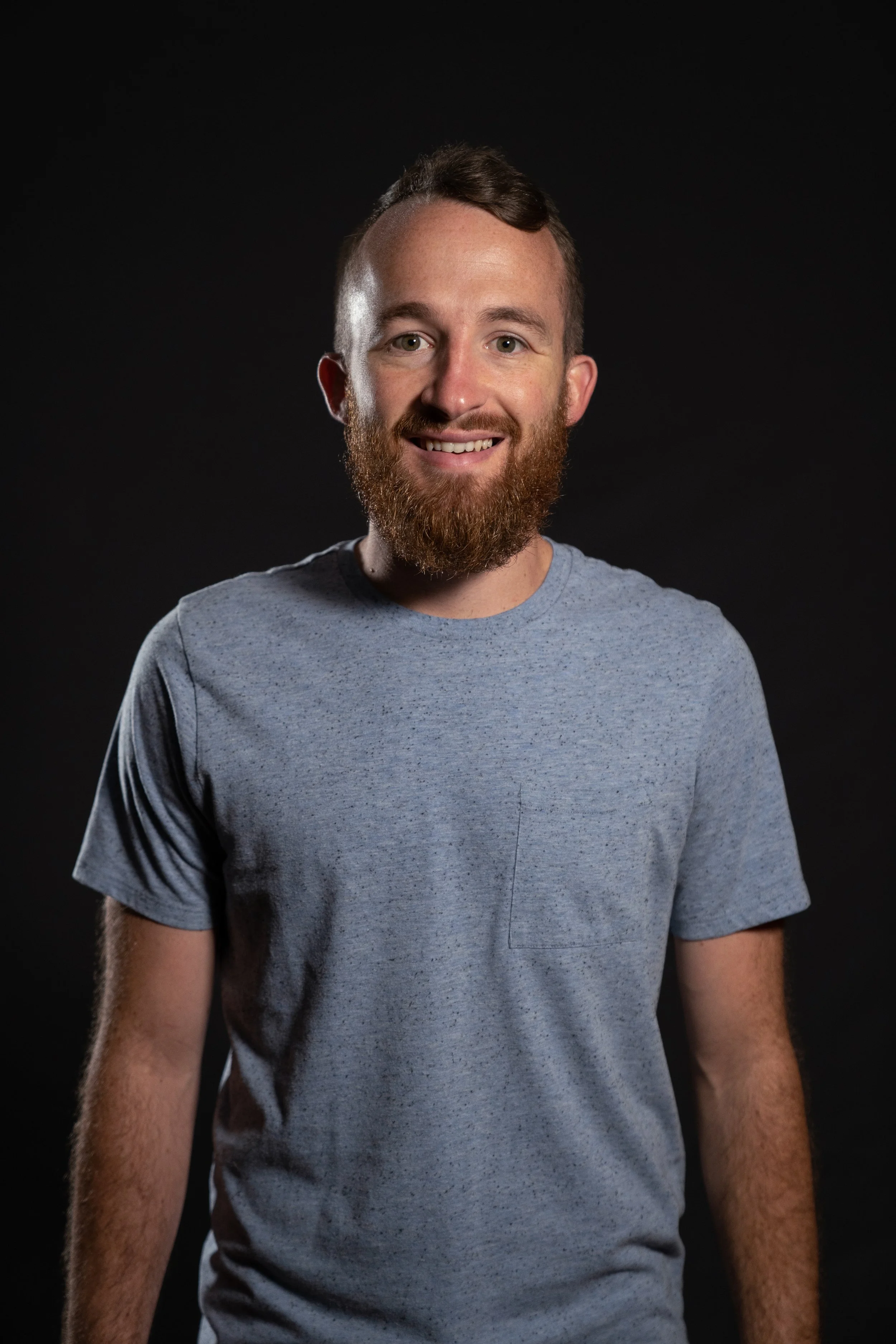 Portrait of a smiling man with a beard and short brown hair, wearing a gray T-shirt, against a black background.