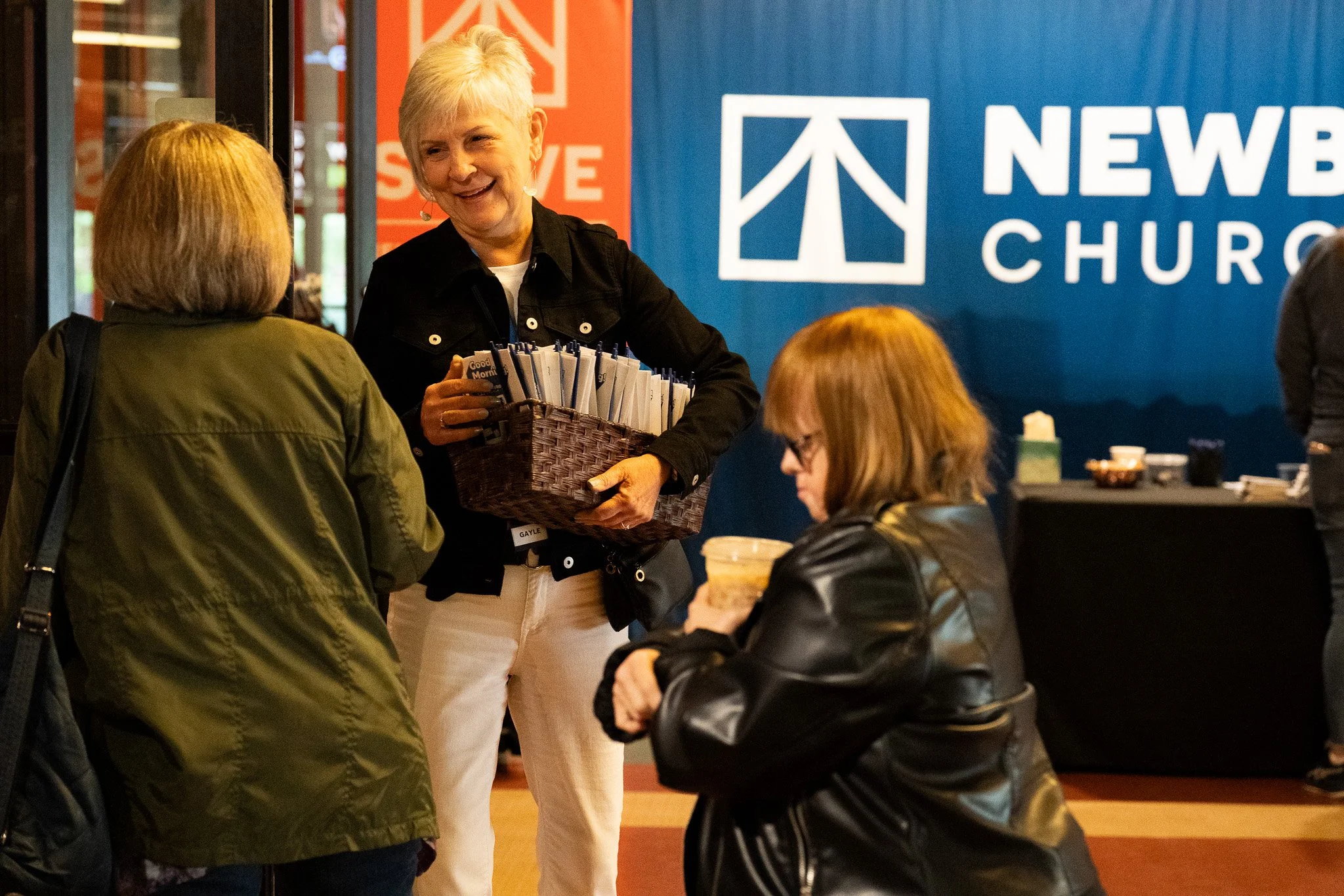 A smiling woman holding a basket of brochures talking to two women at a church event, with a large blue sign reading Newbridge Church in the background.